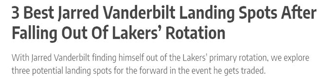 值得一提的是,范德比尔特如今在湖人的处境十分尴尬,在季前赛期间,范德彪在防守端的拼劲赢得了雷迪克的高度评价,被视为关键轮换成员。然而,这位前锋似乎正逐渐跌出轮换阵容,在本赛季出战的14场比赛中,范德比尔特场均仅得到4.6分、5.6个篮板和1.0次抢断,投篮命中率为44.0%,近6场比赛连续被DNP。根据美媒露天看台的说法,湖人管理层现在很“被动”,休赛期湖人高层的补强只是满足东契奇的需求,在詹姆斯没有降薪重签合同后,湖人高层将26-27赛季视为争冠窗口期,明年夏季,他们将会孤注一掷豪赌字母哥,但是没有想到,东里组合带队打出不错的成绩,这让湖人高层很头疼,本赛季到底要不要交易?现阶段,湖人能动的球员不少,范德彪和克莱伯、文森特三人合同合计3000多万的合同,外加克内克特,足以让湖人得到一个球星级的球员。