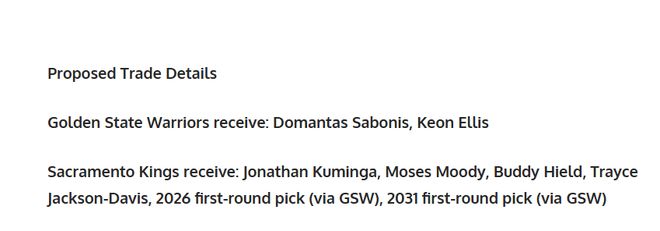 ✅国王得到:库明加、摩西・穆迪、巴迪・希尔德、特雷斯・杰克逊-戴维斯、2026年勇士首轮签、2031年勇士首轮签